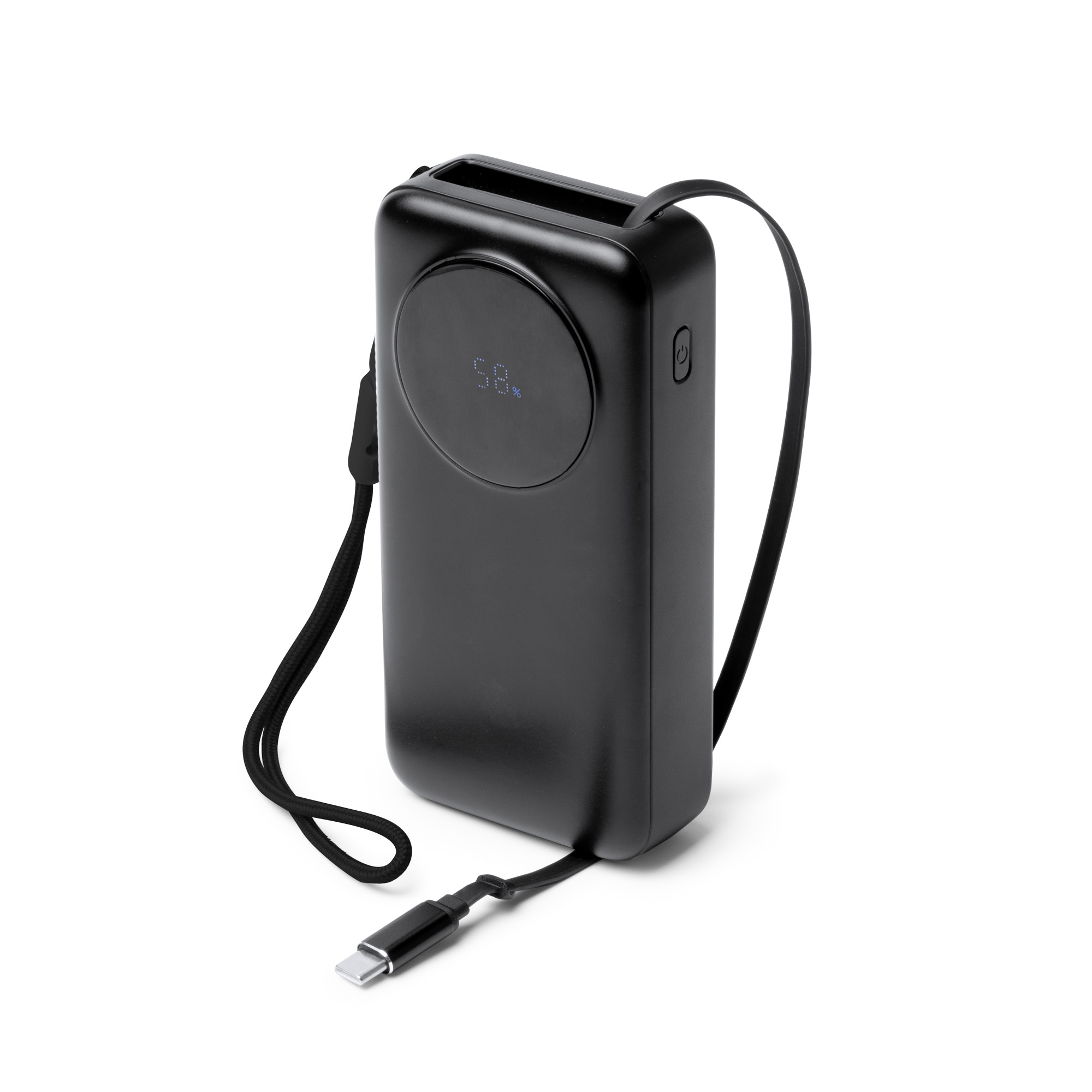 Potente batería externa 20.000mAh elaborada en ABS con salida máxima de corriente de 22,5W. Incorpora amplia pantalla LED con porcentaje de carga y un cable de salida Tipo C extensible en color a conjuto del cuerpo incorporado. Incluye un puerto de entrada y salida Tipo C y otro de salida tipo USB. Incluye cinta de transporte de tela. Esta batería se caracteriza por su gran capacidad.