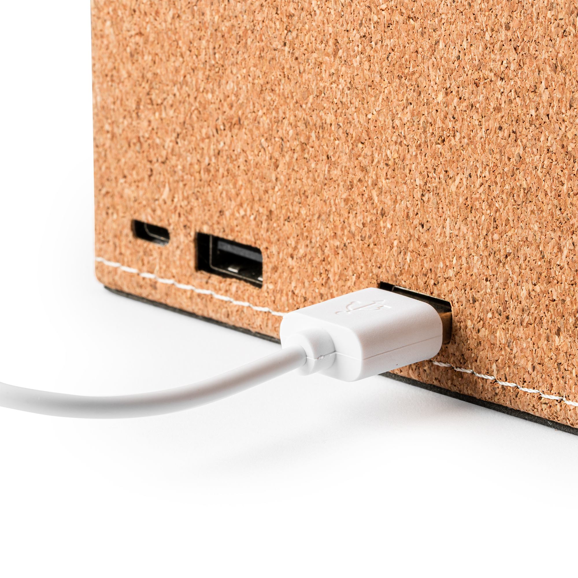 Portalápices con superficie de carga inalámbrica integrada con potencia de 5W. Realizado en corcho natural. Con puerto de entrada de corriente Micro USB. Compatible con dispositivos móviles provistos de tecnología para carga inalámbrica. Incluye 2 puertos USB adicionales en la parte trasera. Con indicador luminoso de confirmación de carga.