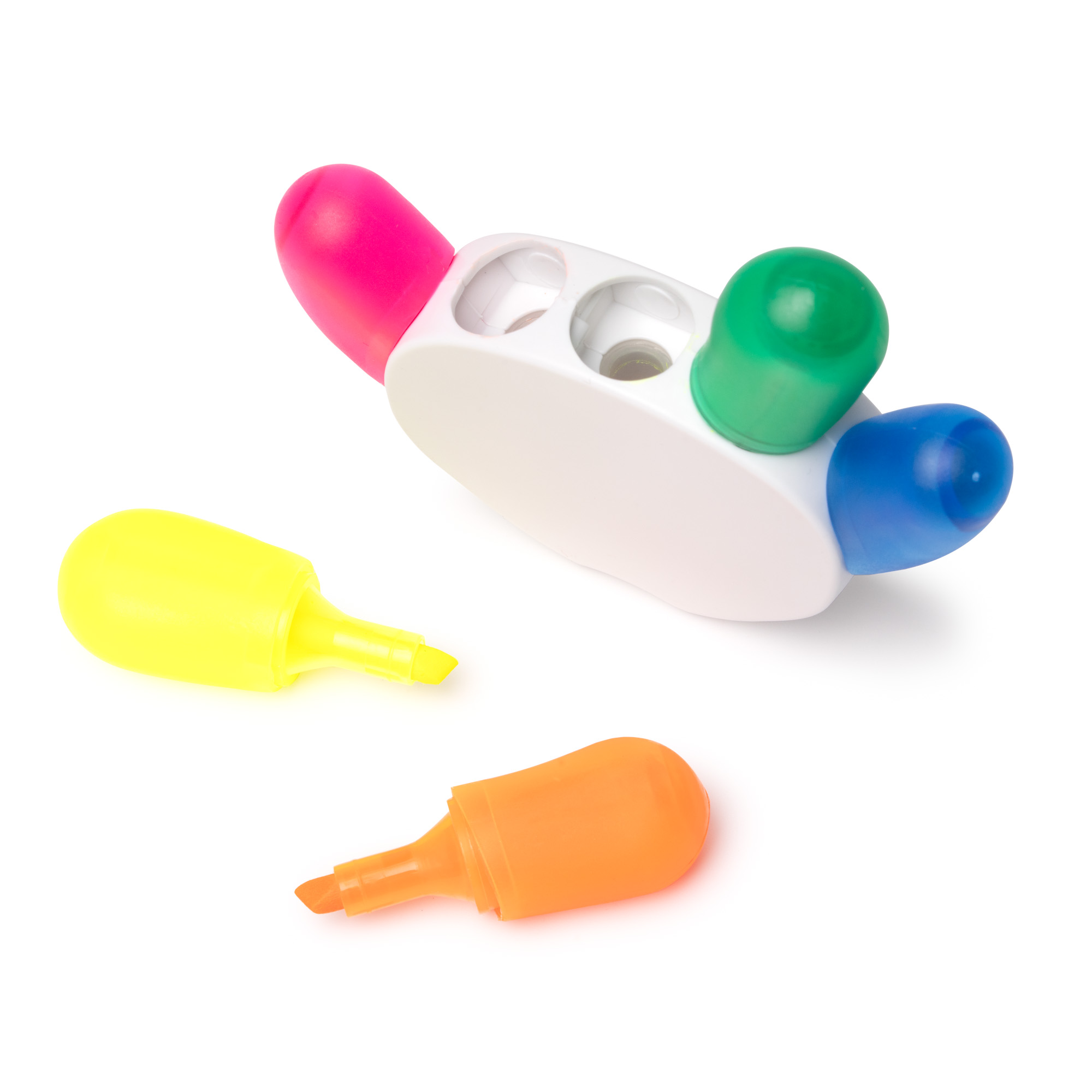 Set de 5 marcadores en diferentes colores con soporte en forma de mano. Elaborado en PP. Marcadores amarillo, fucsia, verde, naranja y azul.