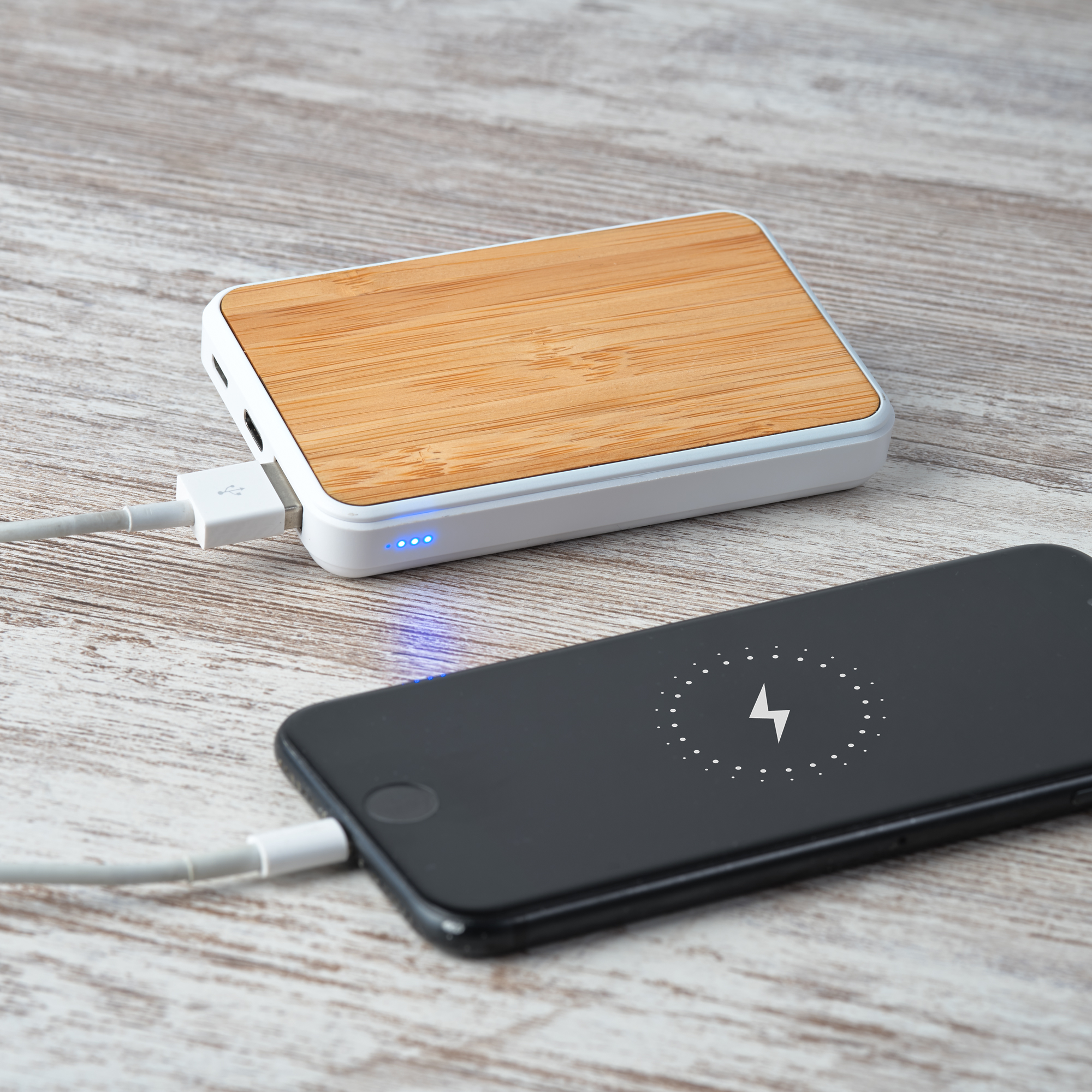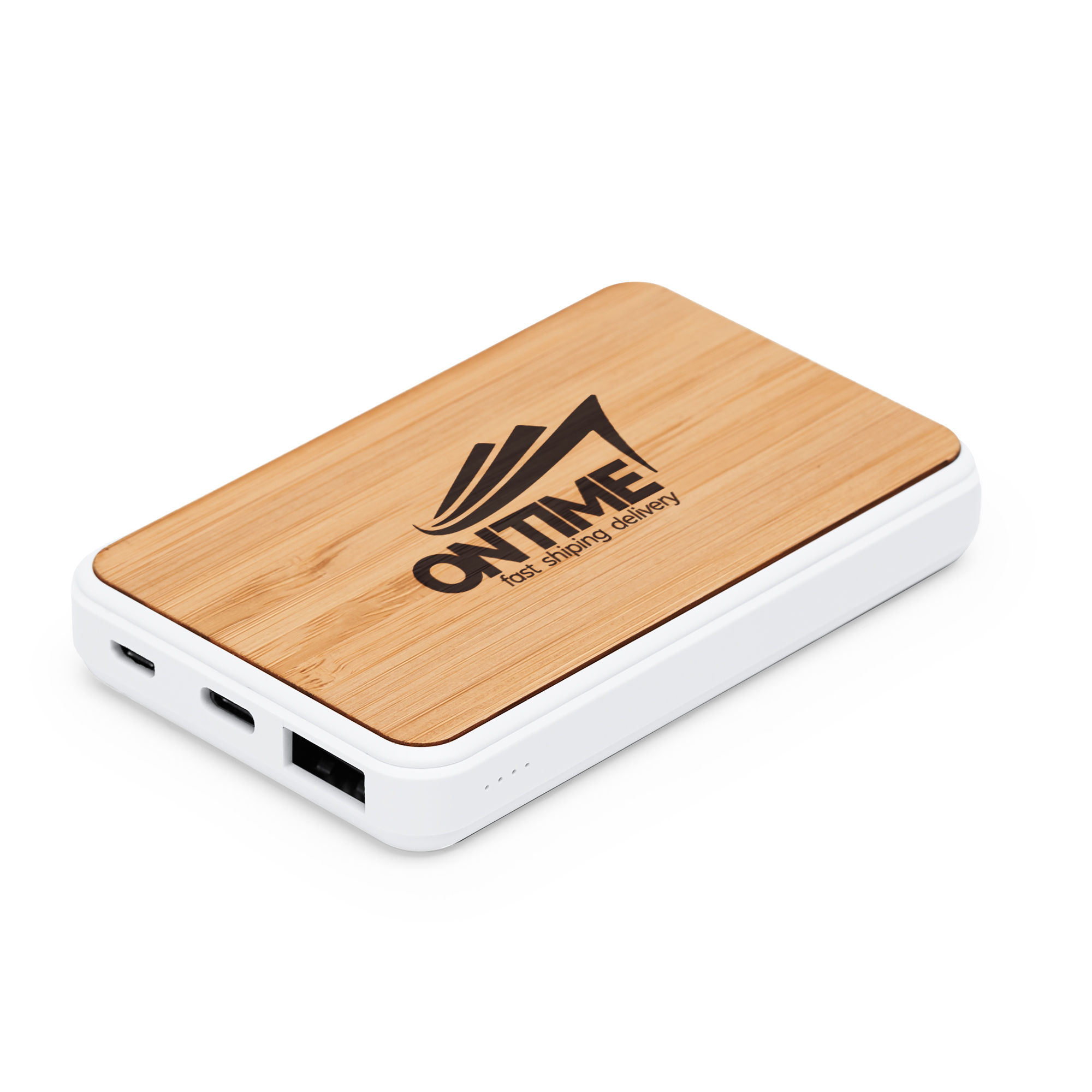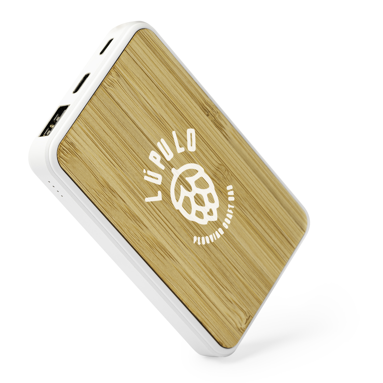 Batería externa de 5000 mAh, con cuerpo rectangular de ABS blanco y superficie de bambú. Cuenta con dos puertos tipo C y puerto USB. Indicador luminoso de carga. Salida corriente tipo C.