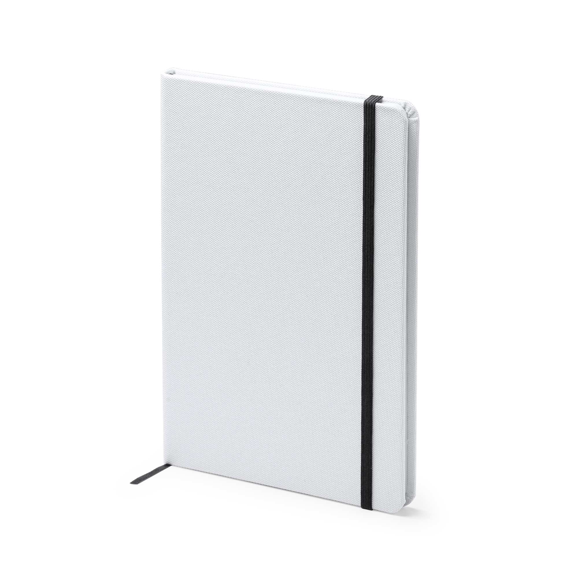 Bloc de notas tamaño A5 ideal para sublimación de tapa rígida. Incluye marcador de páginas y banda elástica de cierre a juego. Contiene con 100 hojas lisas.