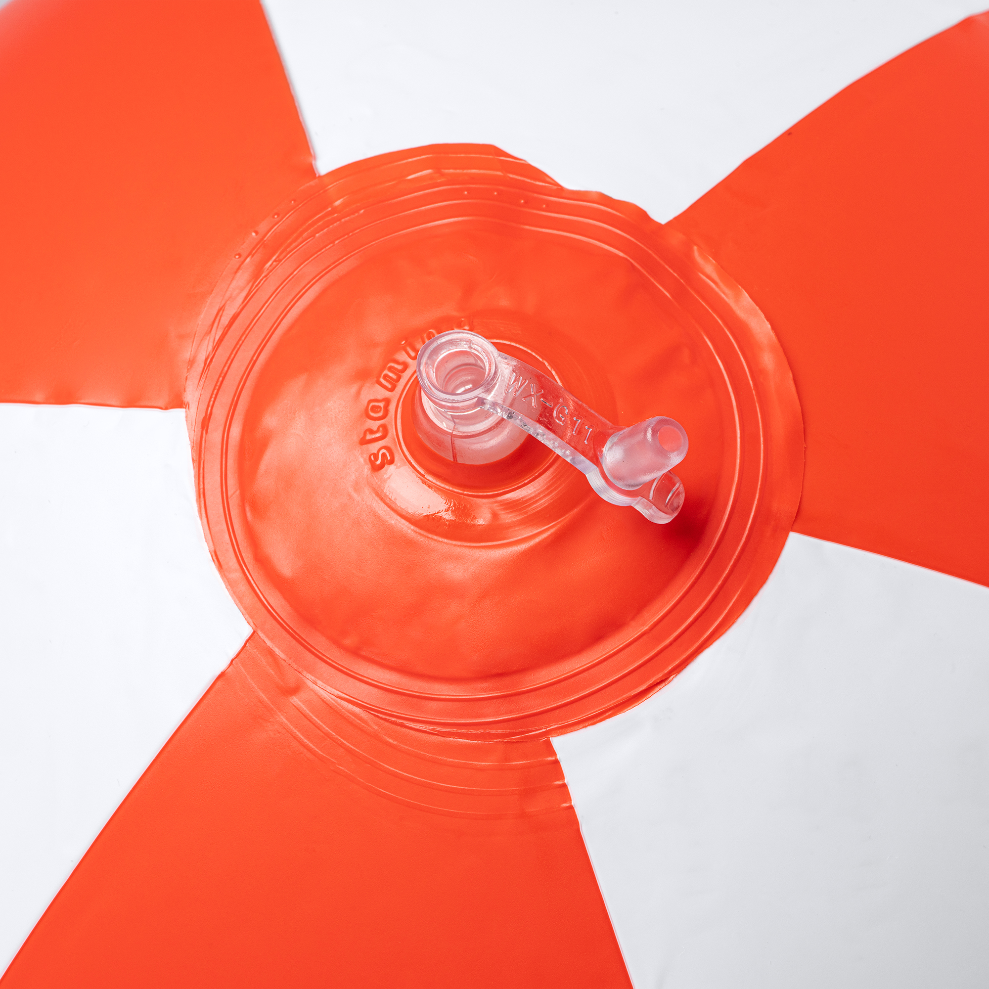 Balón inflable de PVC con válvula de inflado. Disponible en estampado bicolor o color uniforme.