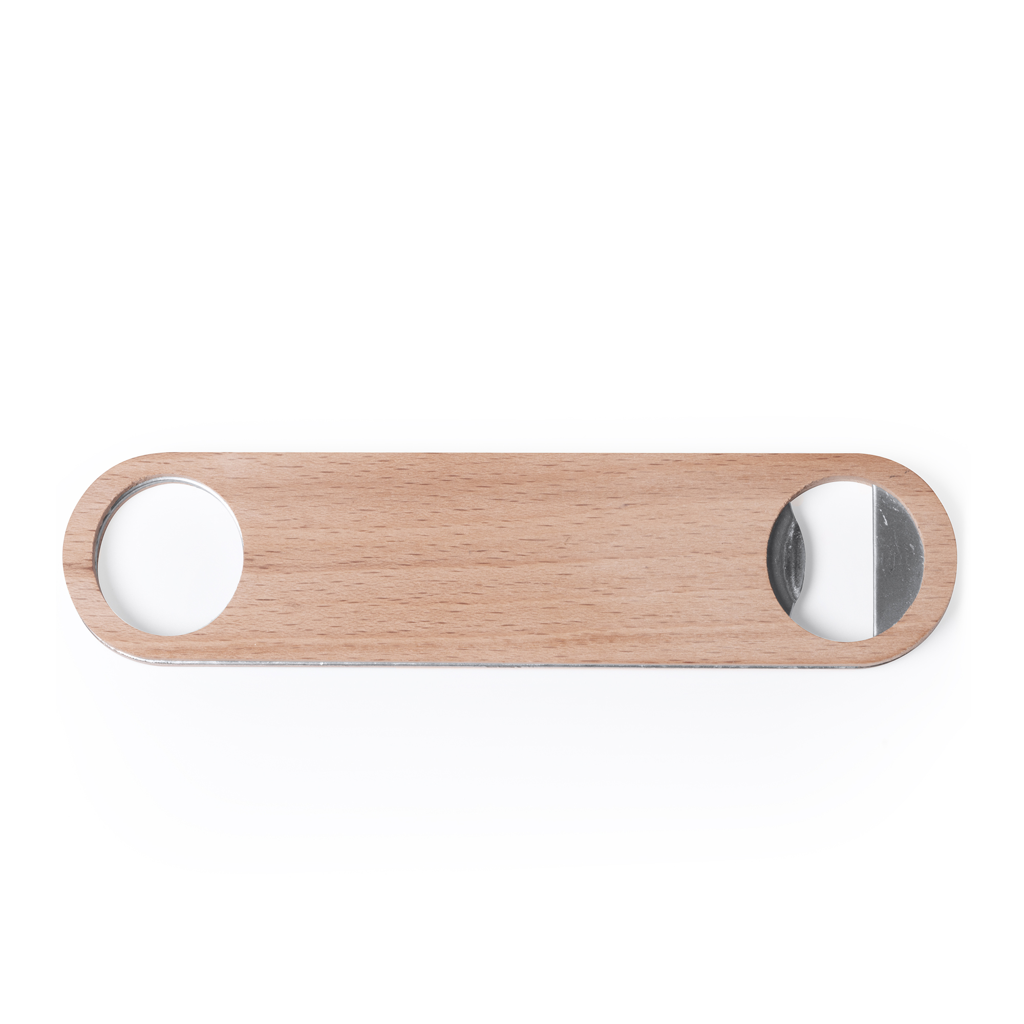 Abridor alargado con un orificio en cada extremo: uno con función abridor y otro como colgador. Realizado en madera natural con interior de acero inoxidable.