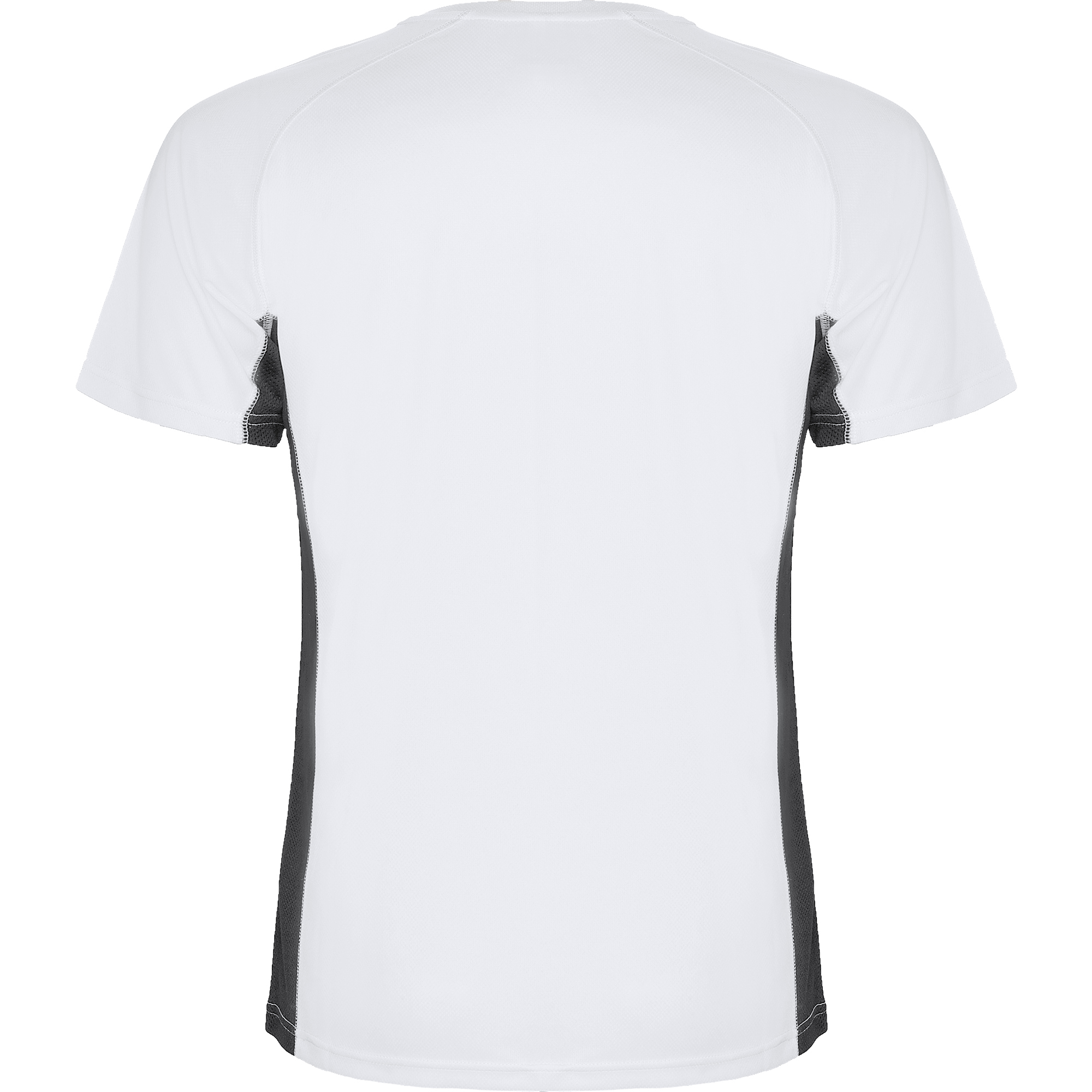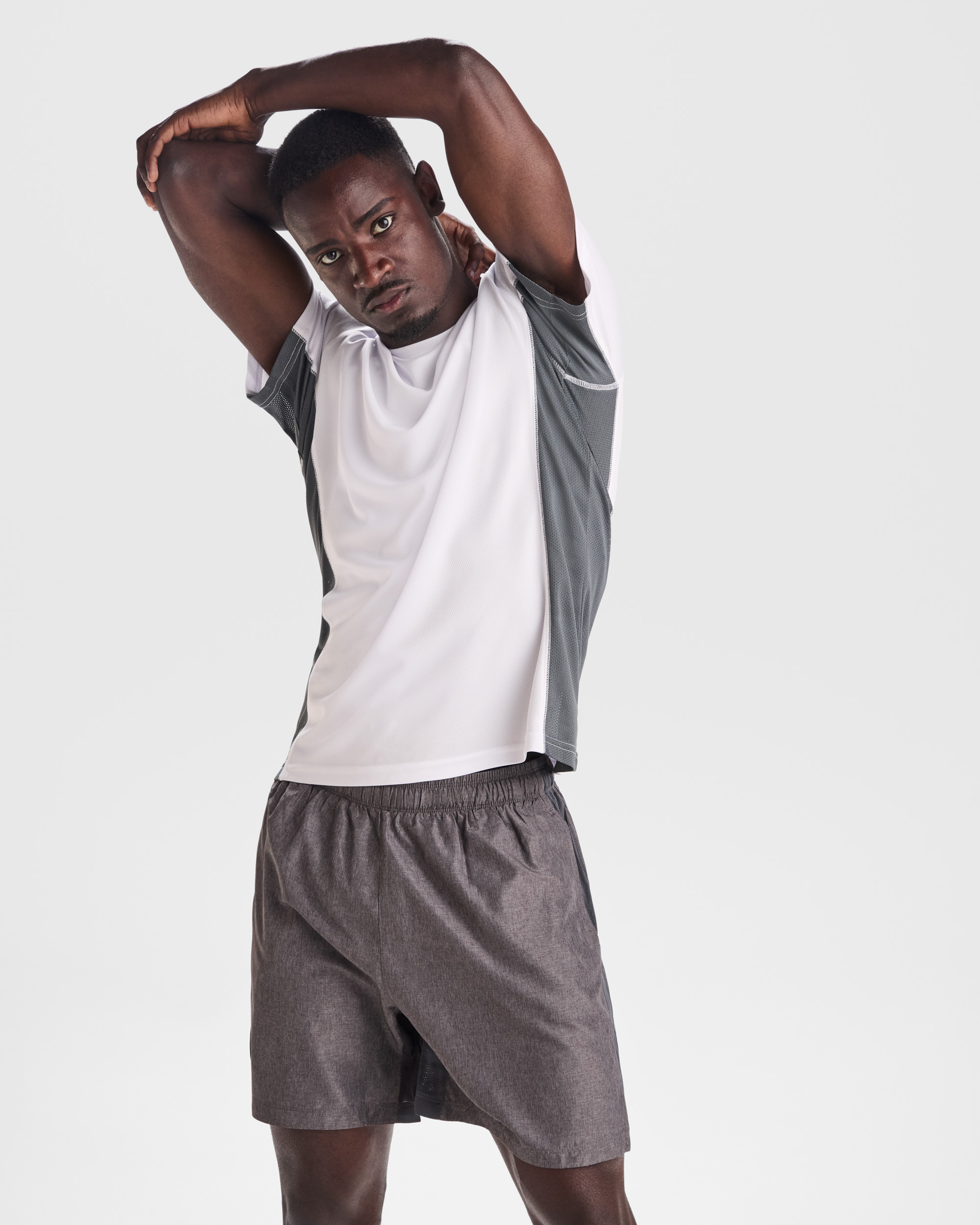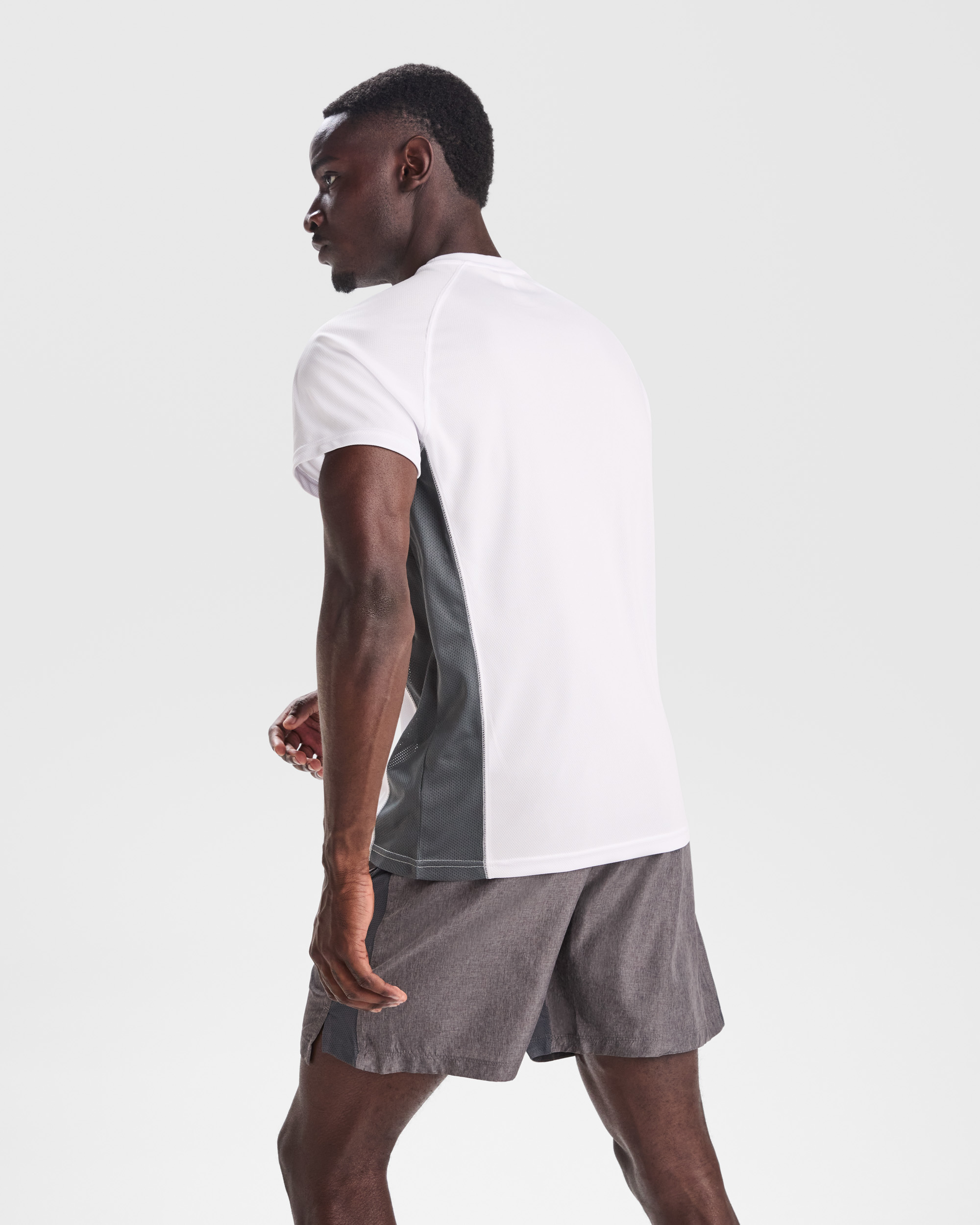 Camiseta técnica manga ranglán transpirable bicolor. Paneles laterales en tejido microperforado. Cuello redondo y cubrecosturas del mismo tejido al tono.