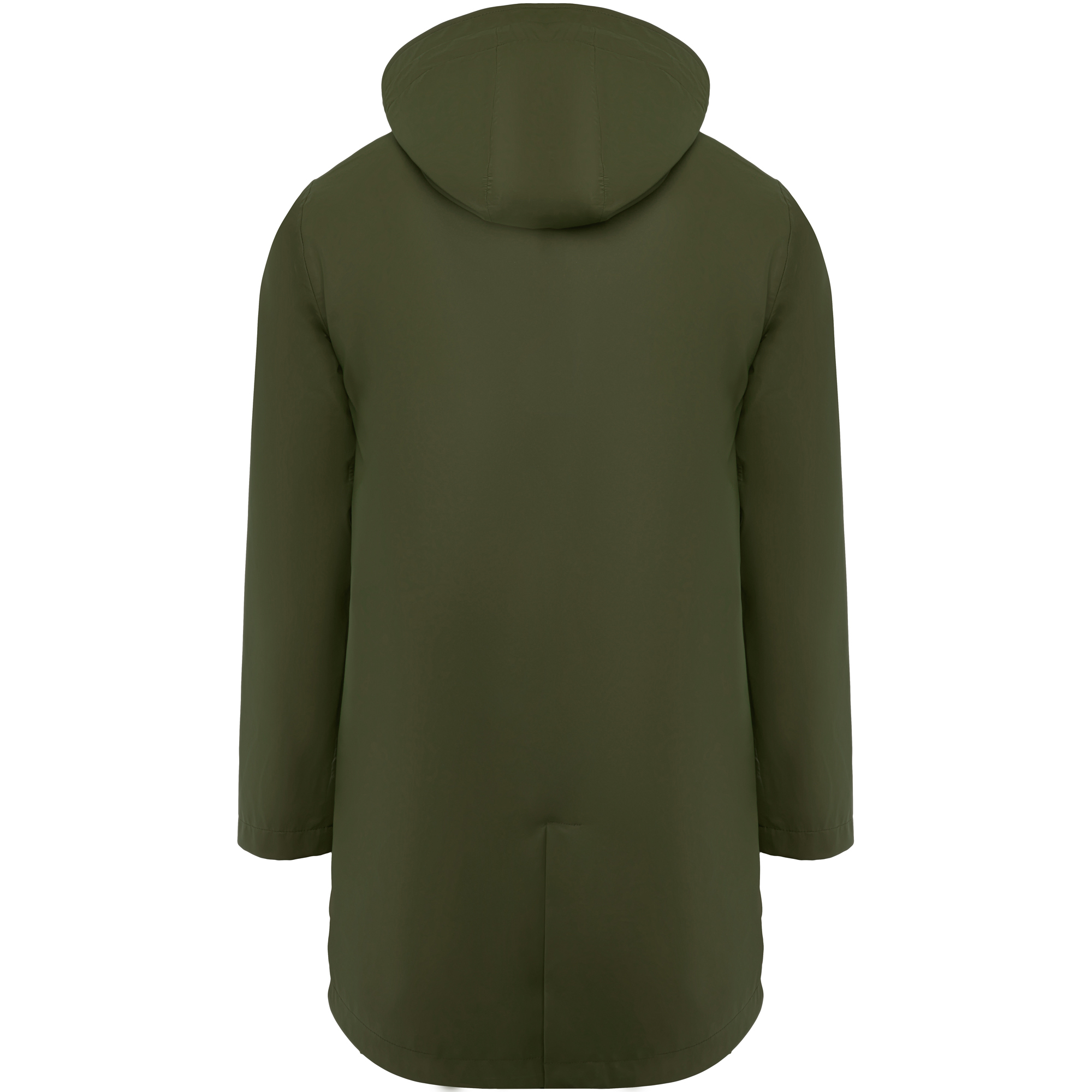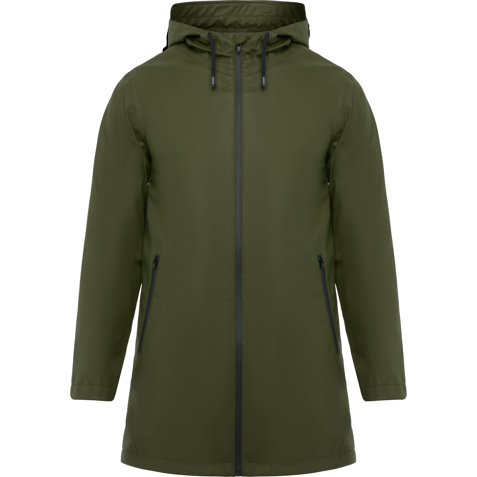 Chubasquero impermeable con capucha fija y visera. Cremallera frontal de doble dirección. Bolsillos laterales y costuras termoselladas. Cordón ajustable en capucha. Apertura trasera. Acceso interior para reprocesos.