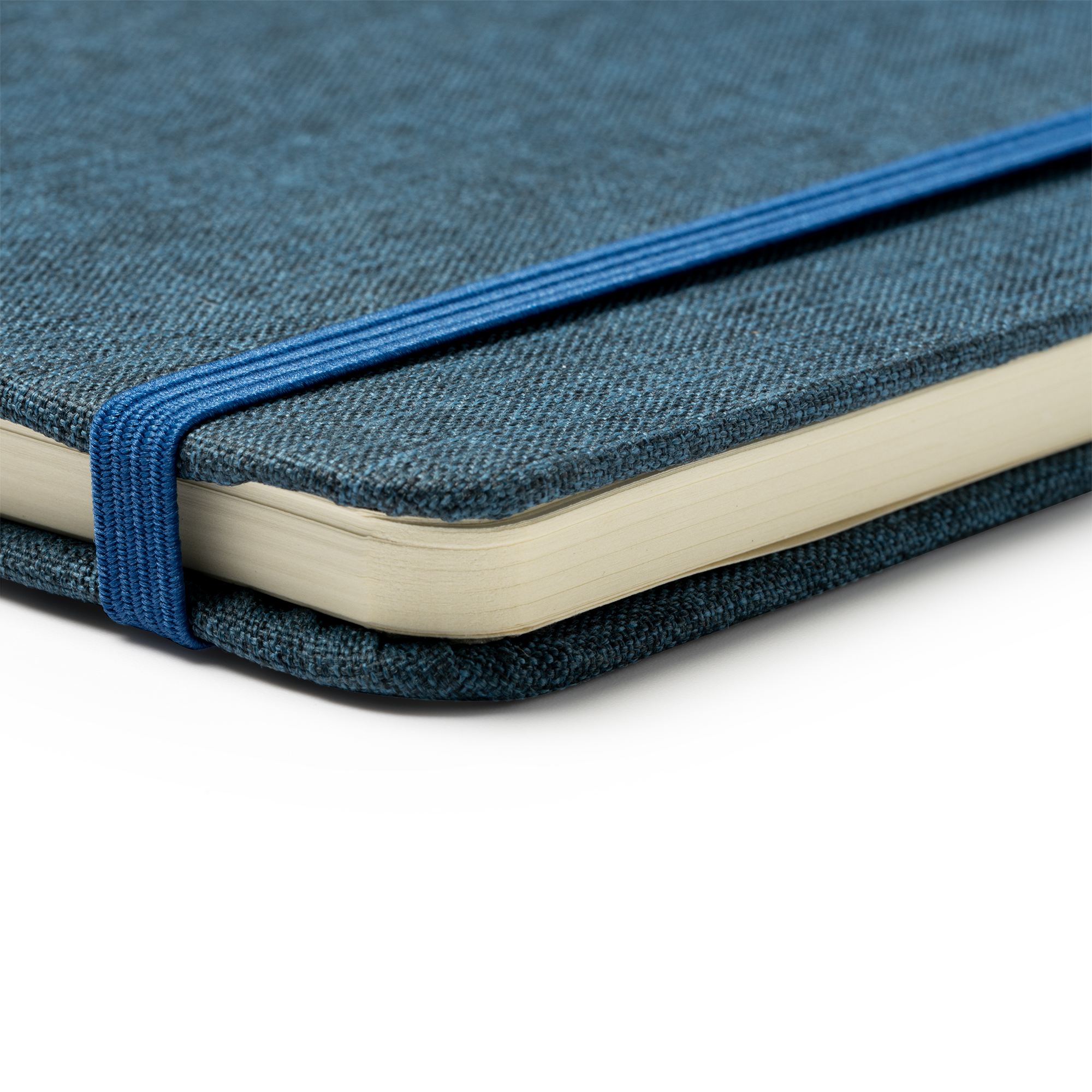 Bloc de notas A5 con tapa rígida de RPET. Marcapáginas y banda elástica a juego. Bloc de notas con 80 hojas lisas.