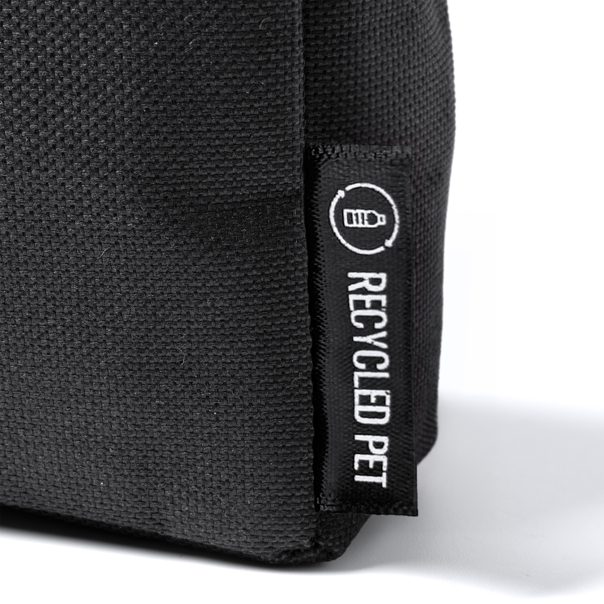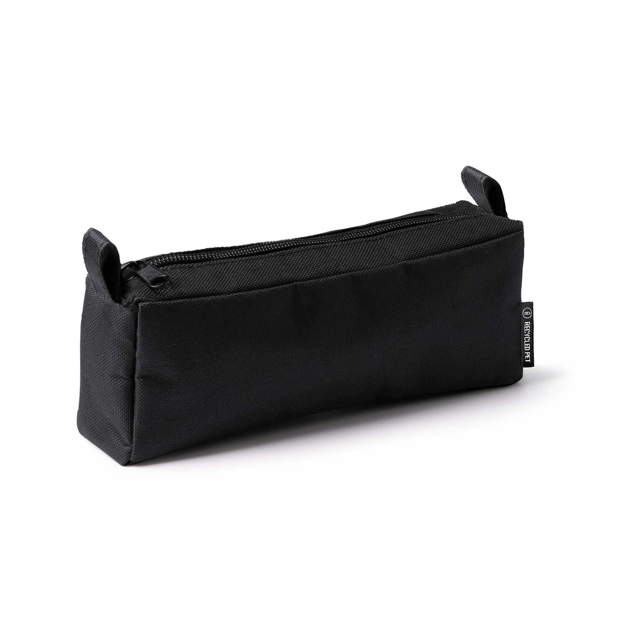 Estuche rectangular elaborado de material RPET procedente de botellas recicladas. Cuenta con cremallera a juego y cintas tiradoras en los laterales. Disponible en varios colores.