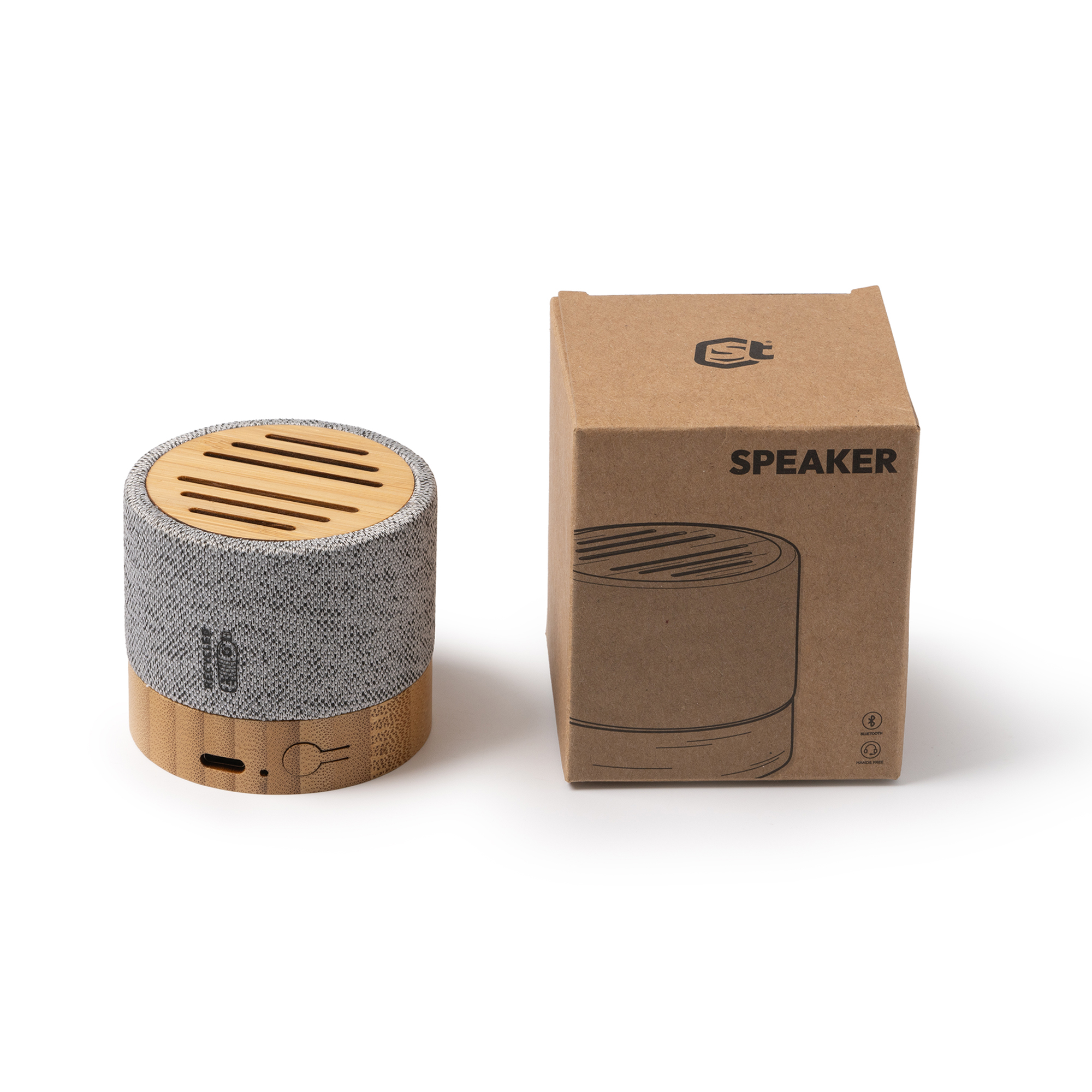 Altavoz inalámbrico redondo con base y superficie elaboradas en bambú y cuerpo en tejido gris RPET. Con 3W de potencia y batería recargable de litio. Con conexión Tipo C de carga. Cuenta con indicador luminoso de carga. Reproducción de sonido vía Bluetooth. Hasta 4 horas de funcionamiento continuo y hasta 10 metros de distancia de funcionamiento.