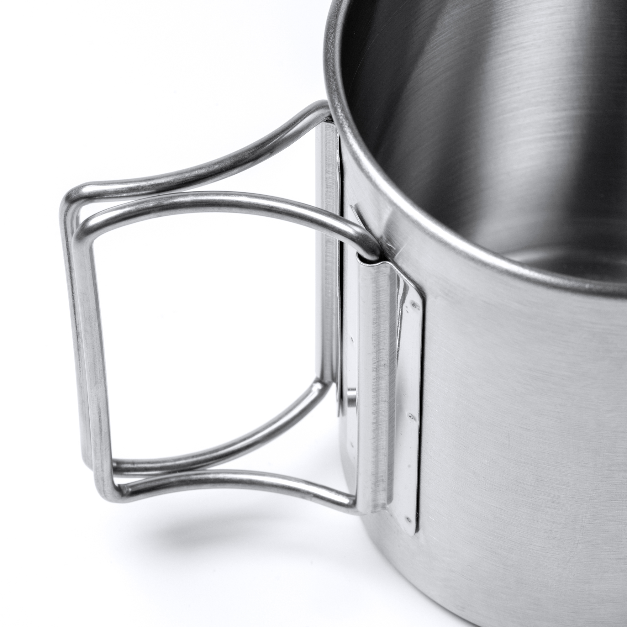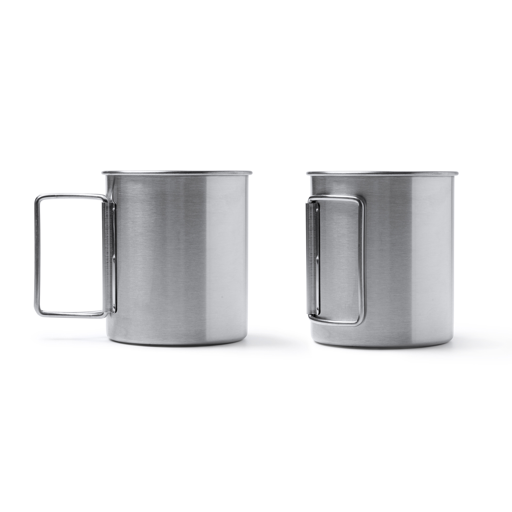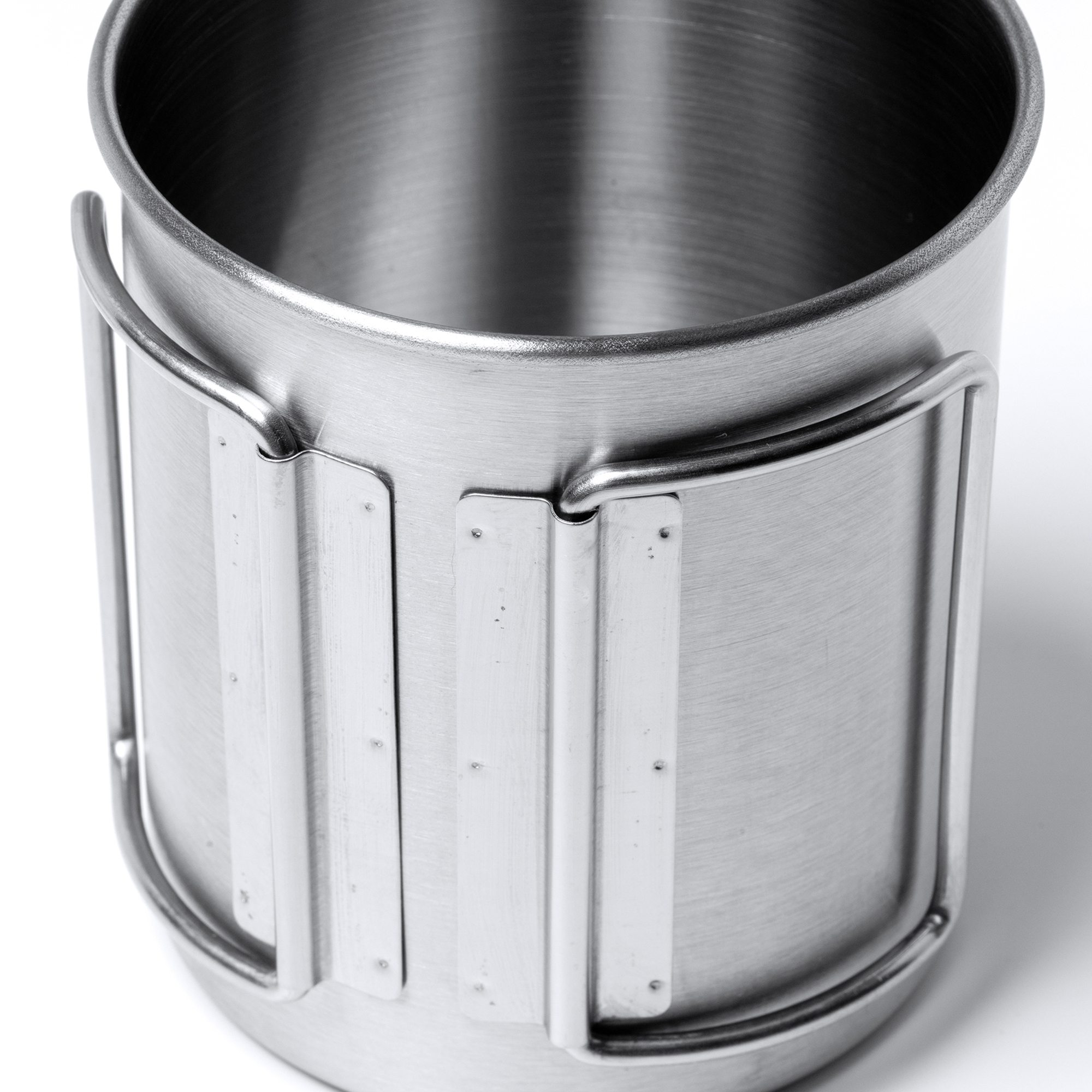 Taza de acero inoxidable 304 con asas plegables. Capacidad 450 ml. Idónea taza para acampada o aventura.