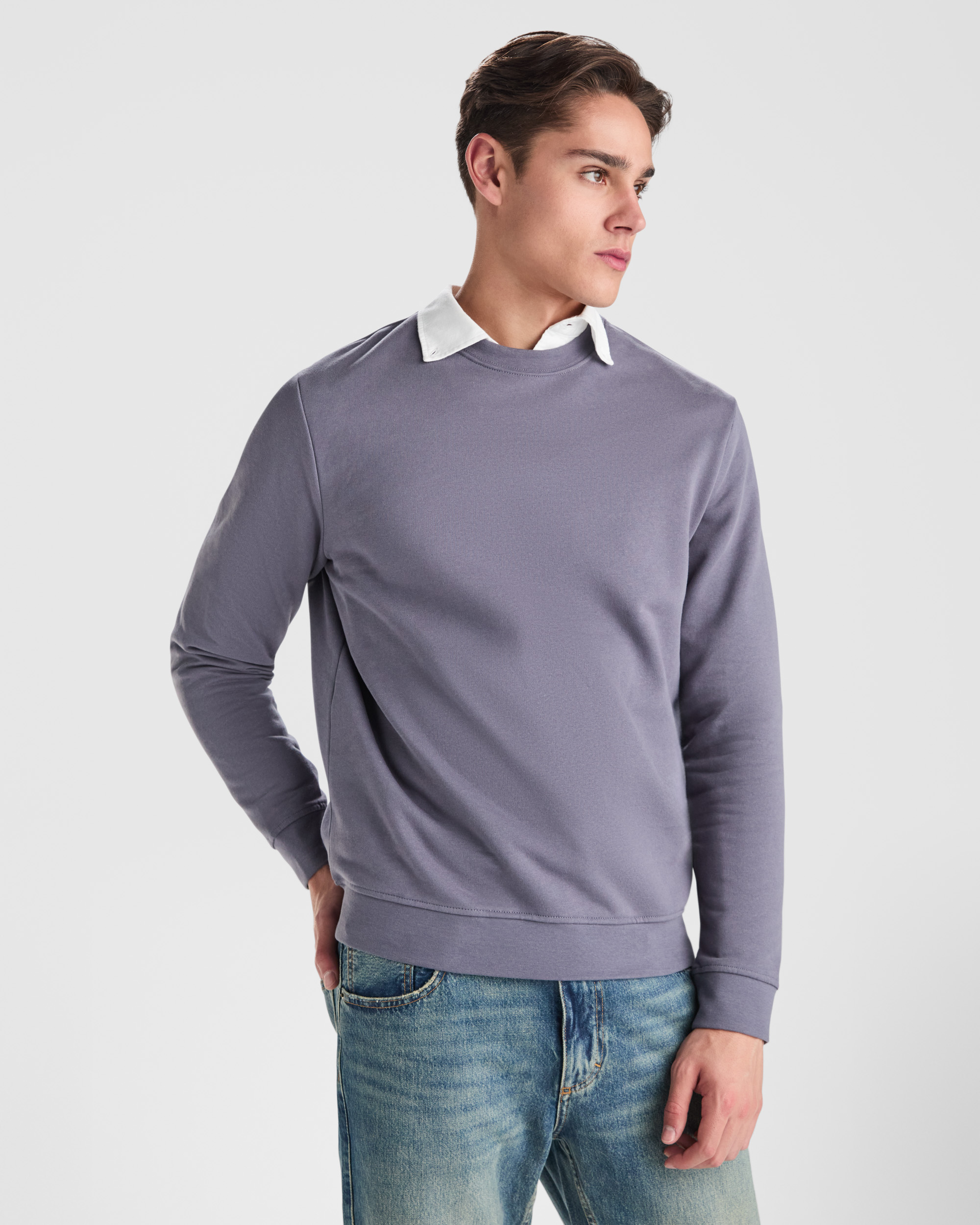 Sudadera unisex cuello redondo. Cuello, puños y cinturilla en canalé 2×1 con elastano. Cubrecosturas del mismo tejido.