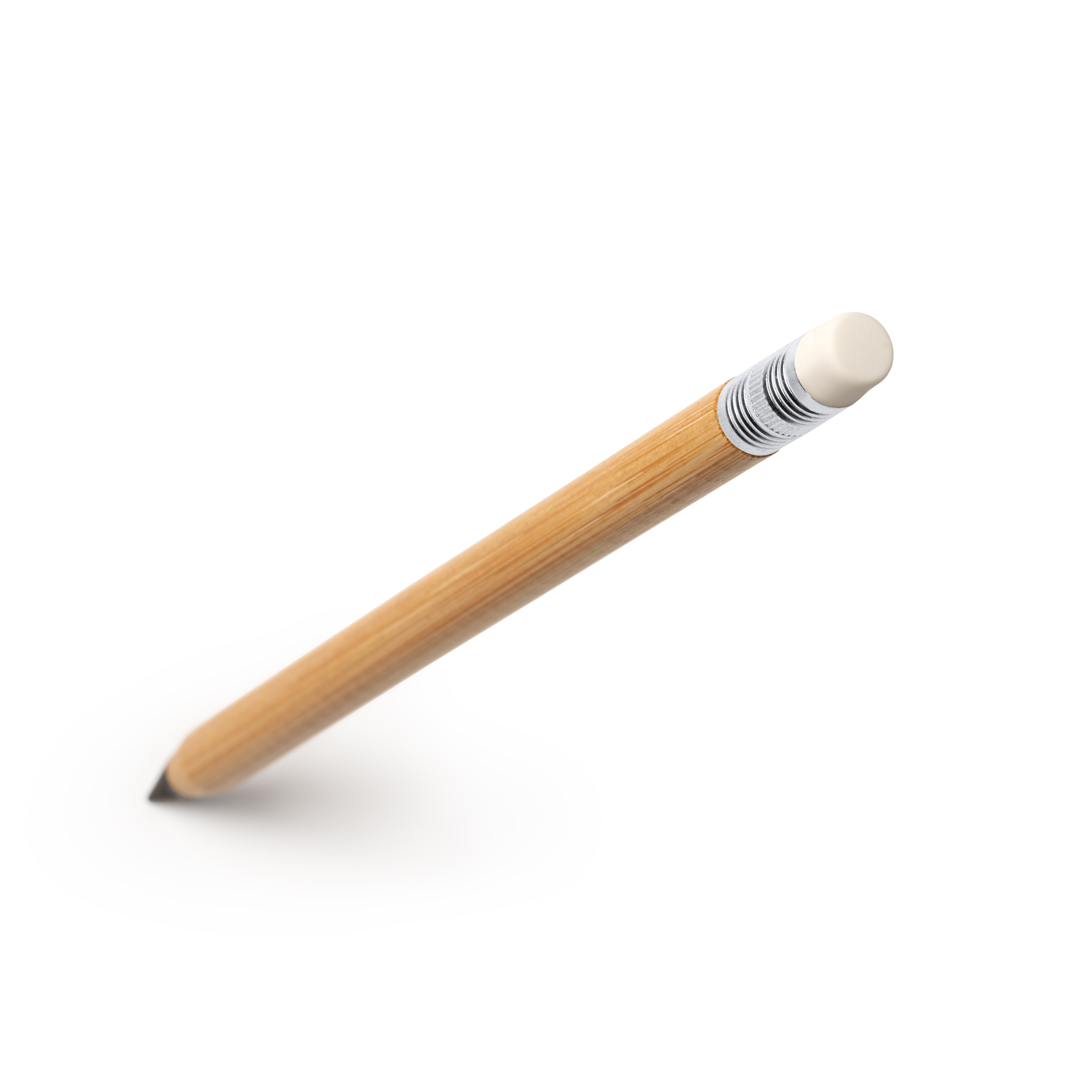 Lápiz infinito con cuerpo de bambú. Punta de grafito de escritura infinita reemplazable con borrador en el extremo y capucha transparente.