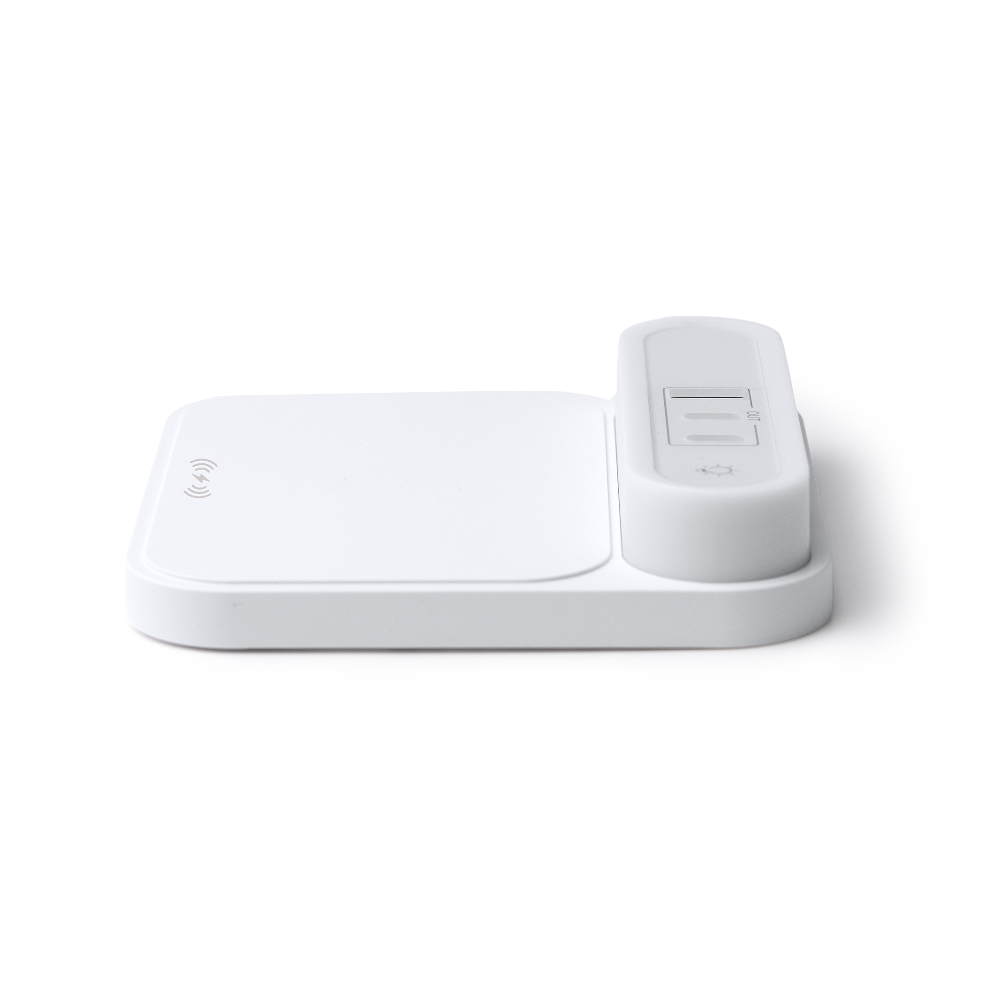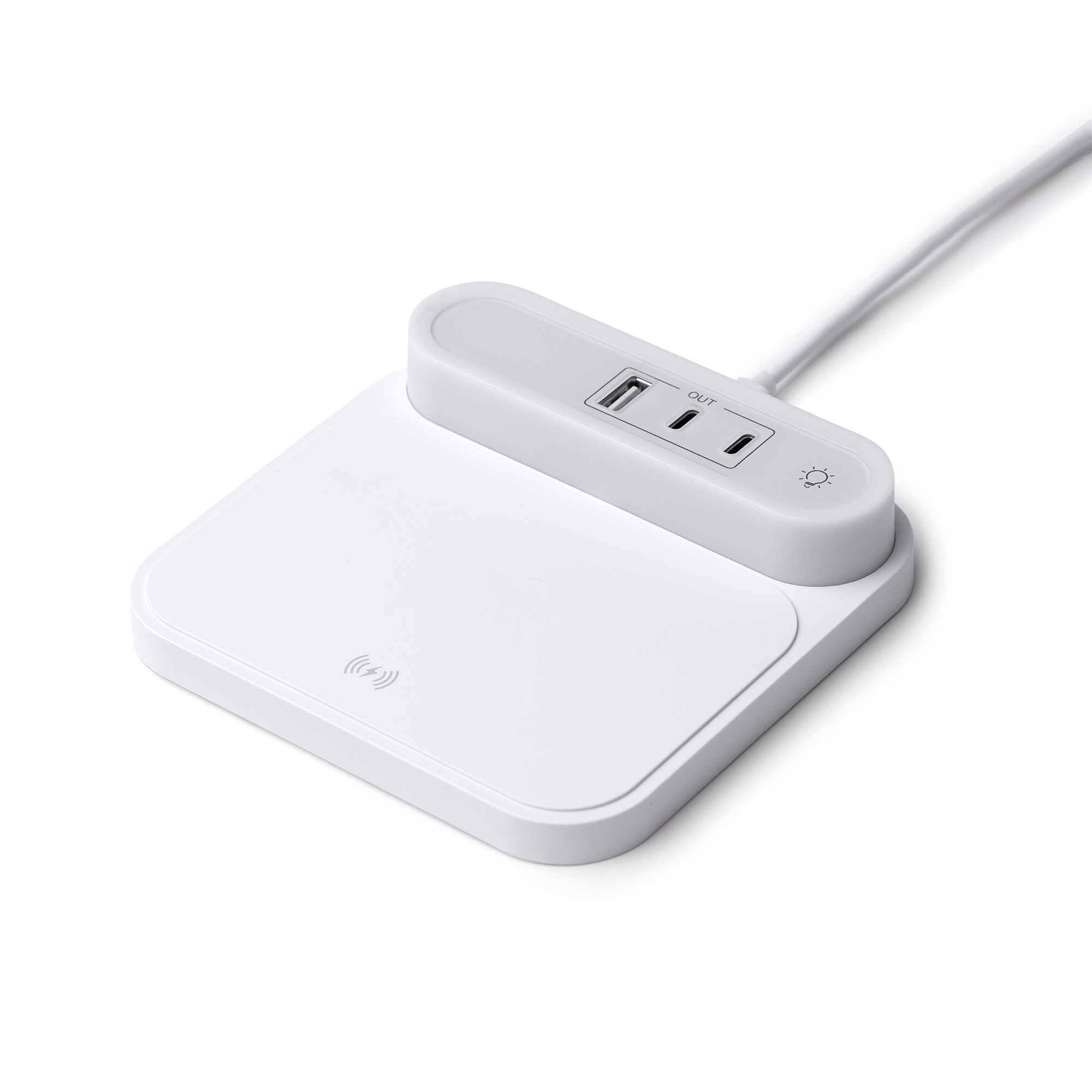 Base de carga inalámbrica con lámpara incorporada. Carga rápida 15W. Cuenta con dos salidas para carga mediante cable Tipo C y una para cable USB. Con conexión a corriente mediante cable Tipo C, incluido.