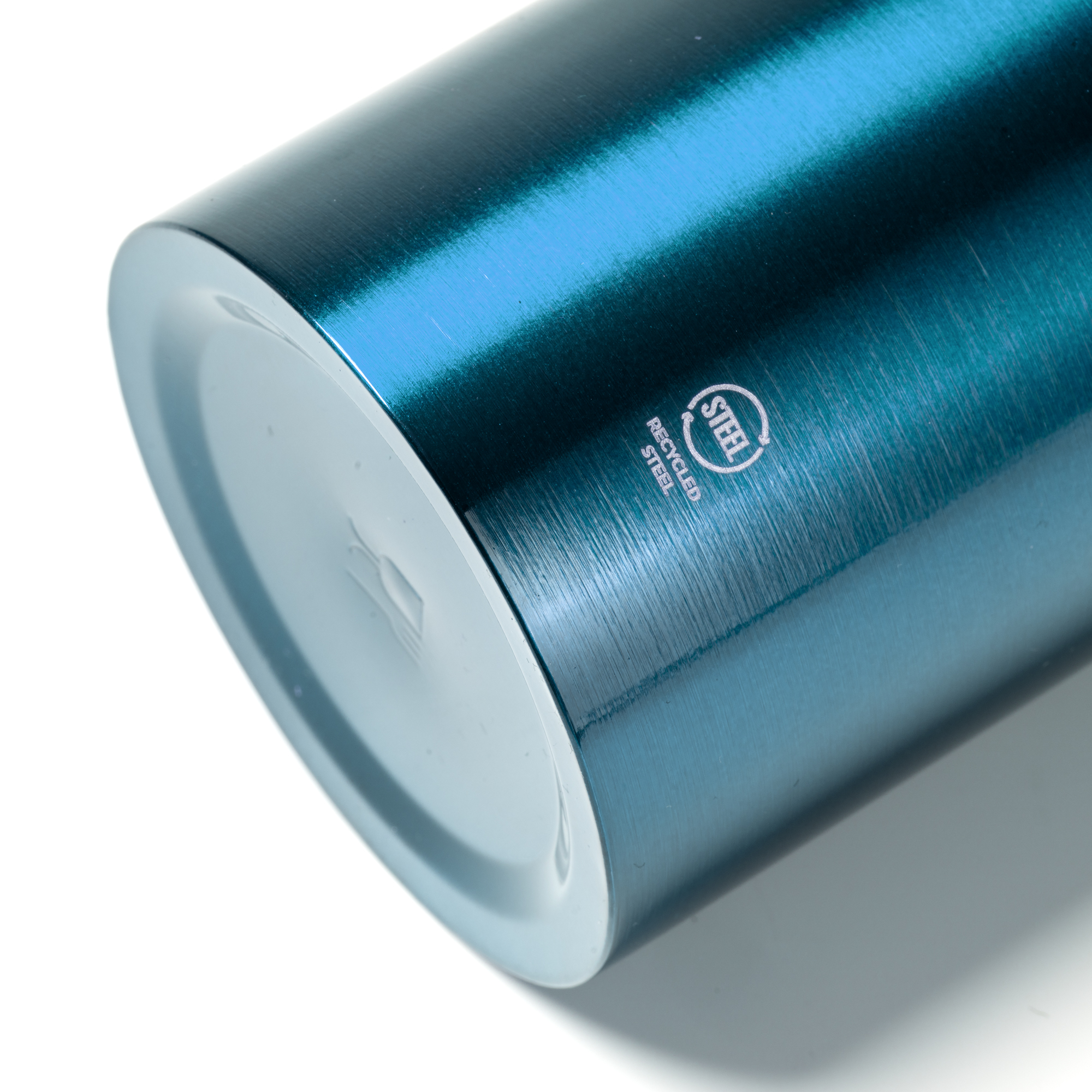 Bidón de acero inoxidable 304 reciclado. Con capacidad para 750 ml y acabado metalizado. Cuenta con tapón a rosca con silicona para evitar el goteo de las bebidas. Incorpora también un mosquetón en el tapón para hacer más fácil su transporte.