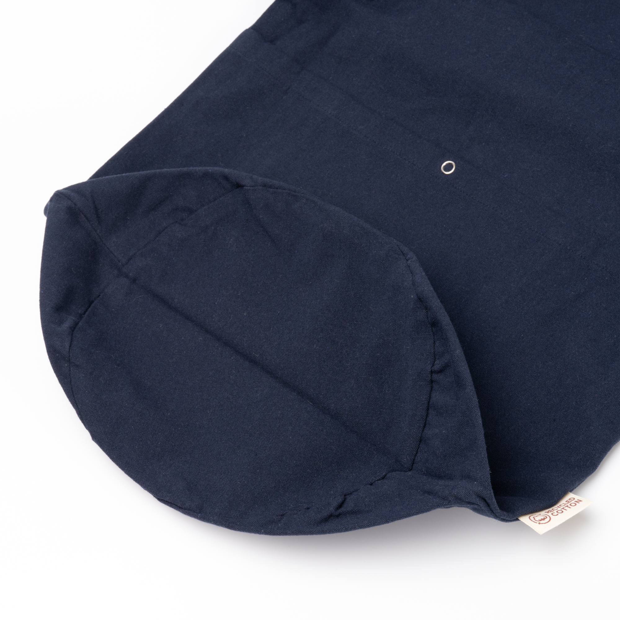 Bolsa petate realizada en algodón reciclado de 240 g/m². Cuenta con un compartimento principal amplio, además de un bolsillo frontal con cierre de botón y bolsillo interior para el almacenamiento de pequeños objetos. Cuenta con un asa ajustable para mayor comodidad y versatilidad en el transporte, adaptándose a diferentes medidas de longitud.