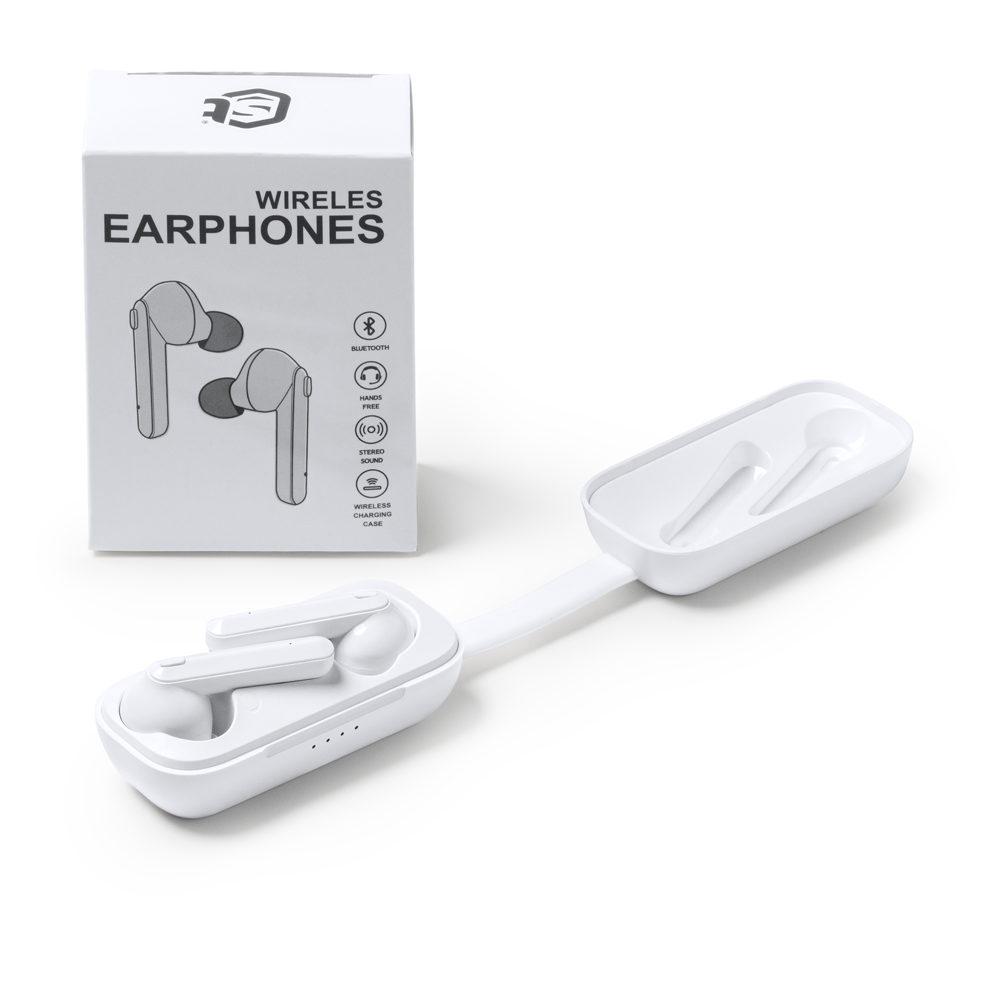 Auriculares inalámbricos Bluetooth 5.0 con estuche de carga. Son muy fáciles de usar gracias a su botón multifunción integrado en ambos auriculares. Función manos libres y batería recargable mediante tecnología inalámbrica. Cable incluido.