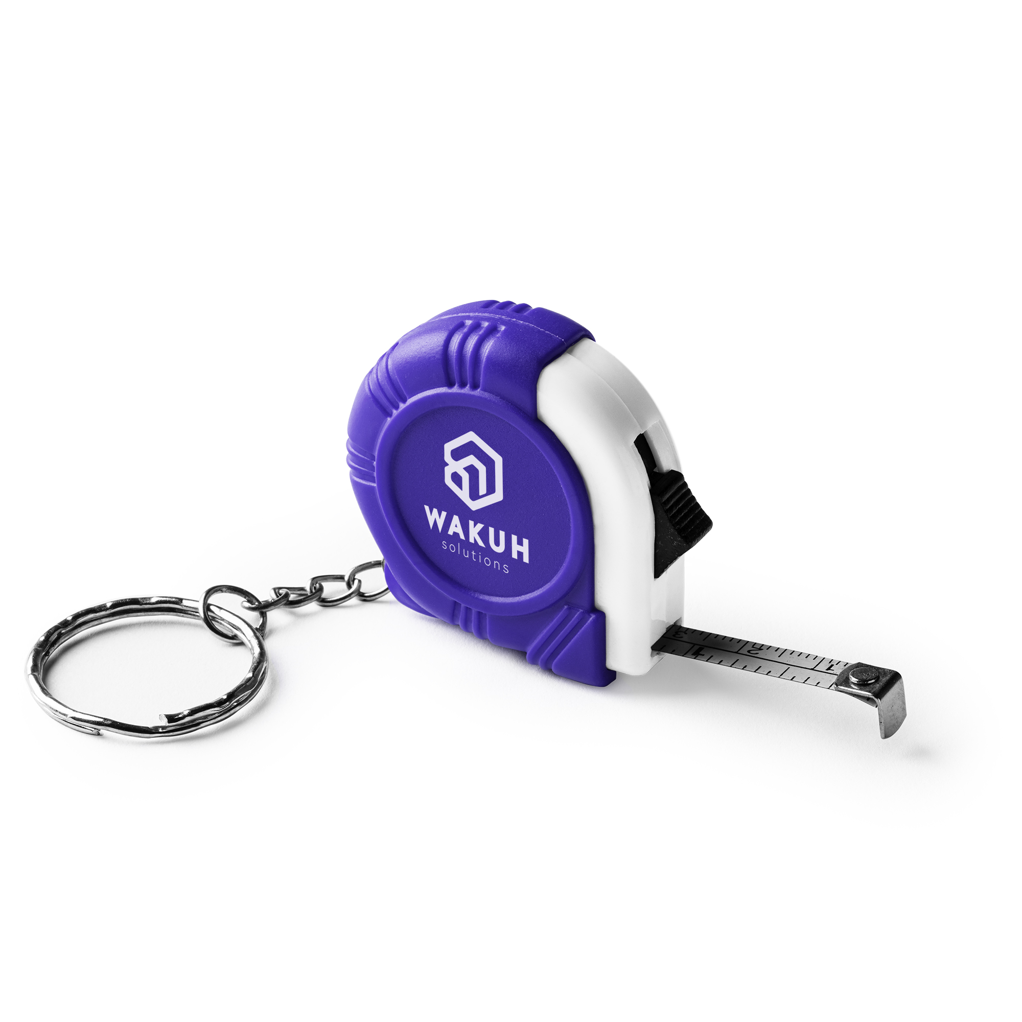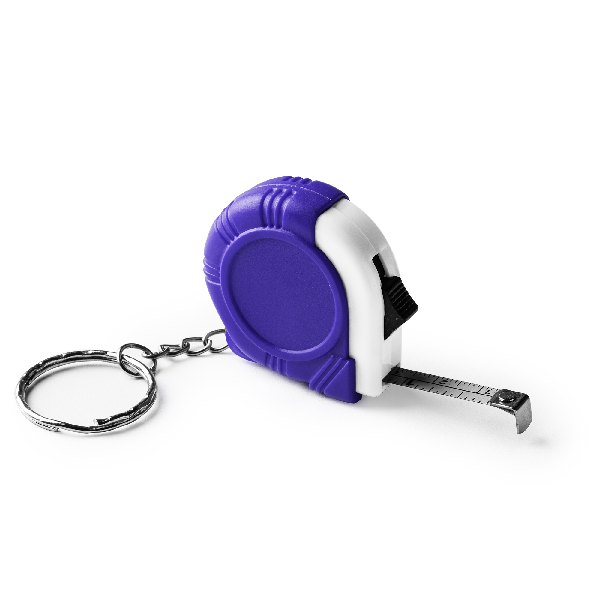 Llavero flexómetro de 1 metro con mecanismo de bloqueo y cuchilla metálica.