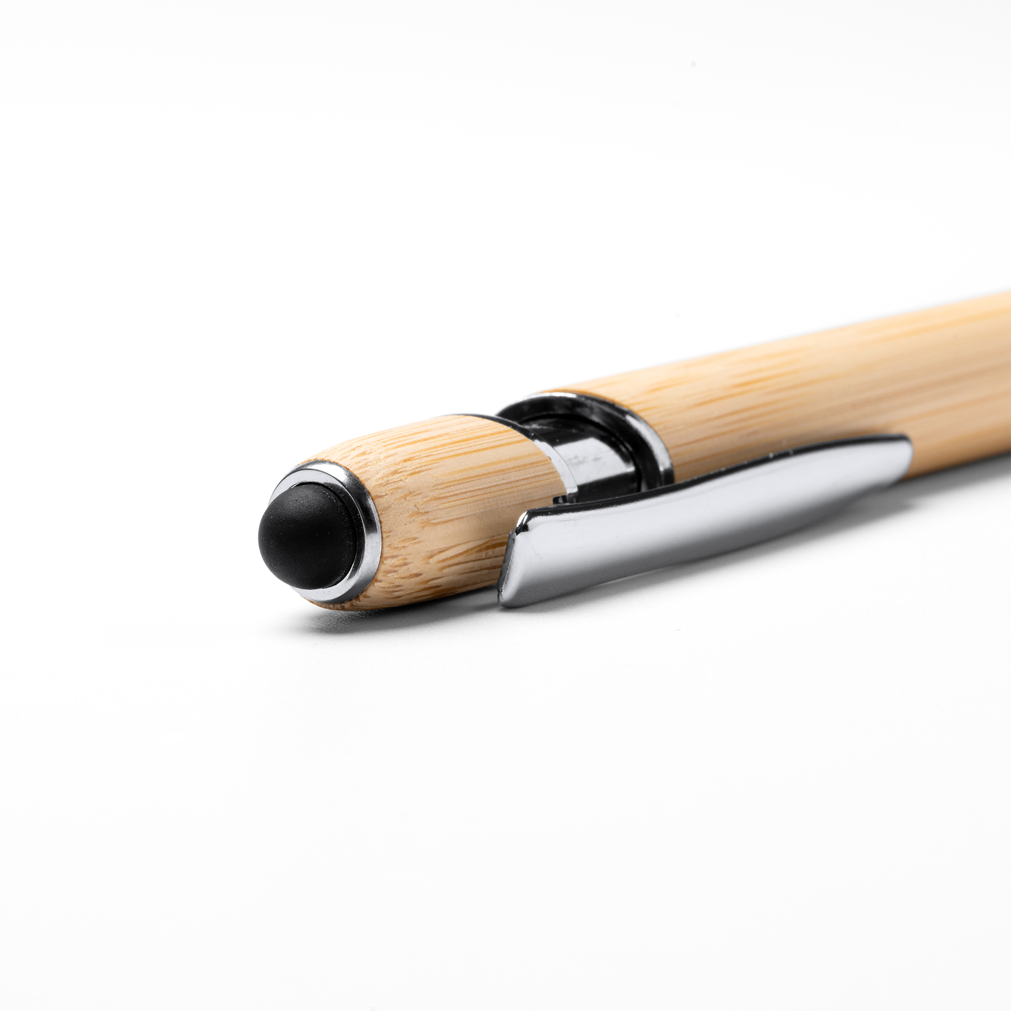 Bolígrafo con cuerpo elaborado en bambú y pulsador en acabado metálico. Con puntero táctil incorporado y mecanismo pulsador. Tinta azul.