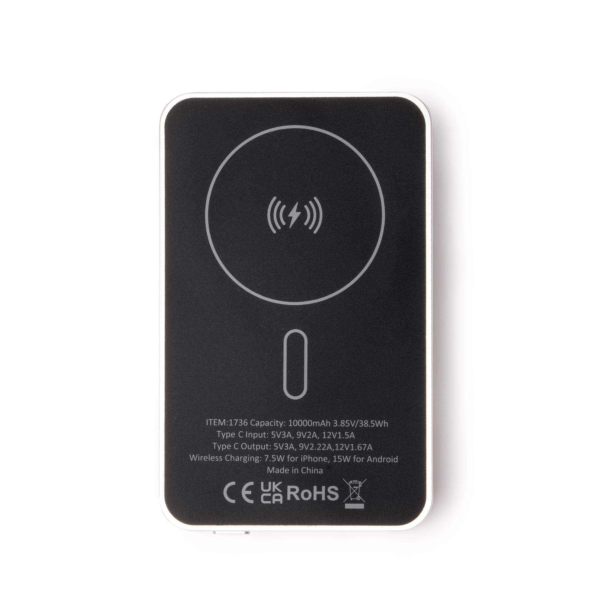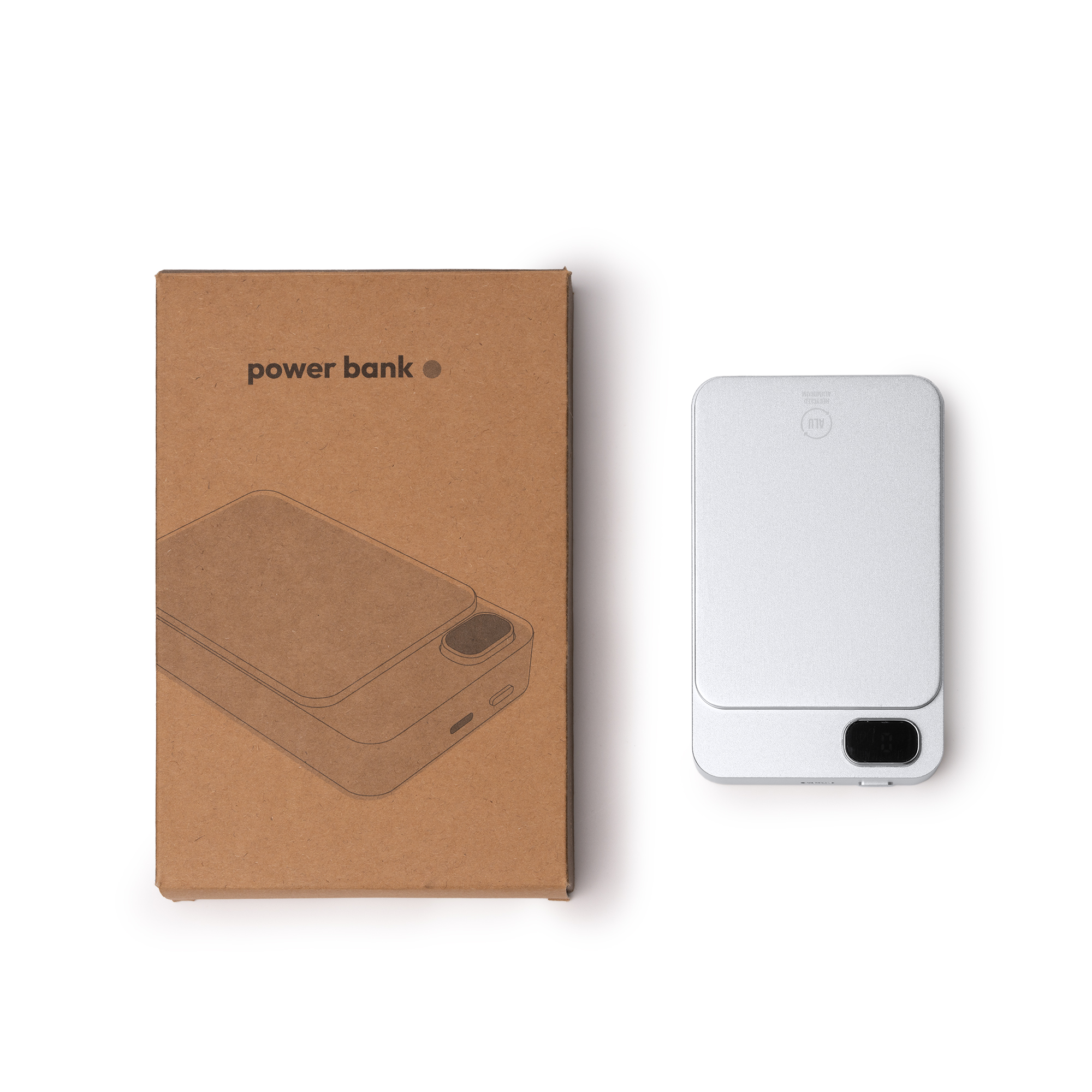 Batería externa magnética de 10000 mAh con cuerpo de aluminio reciclado. Con función de carga inalámbrica para dispositivos provistos de esta tecnología. Pantalla LED con indicador de porcentaje de carga. Puerto Tipo C de entrada y salida. Salida corriente 15W. Incluye cable tipo C y anillo magnético.