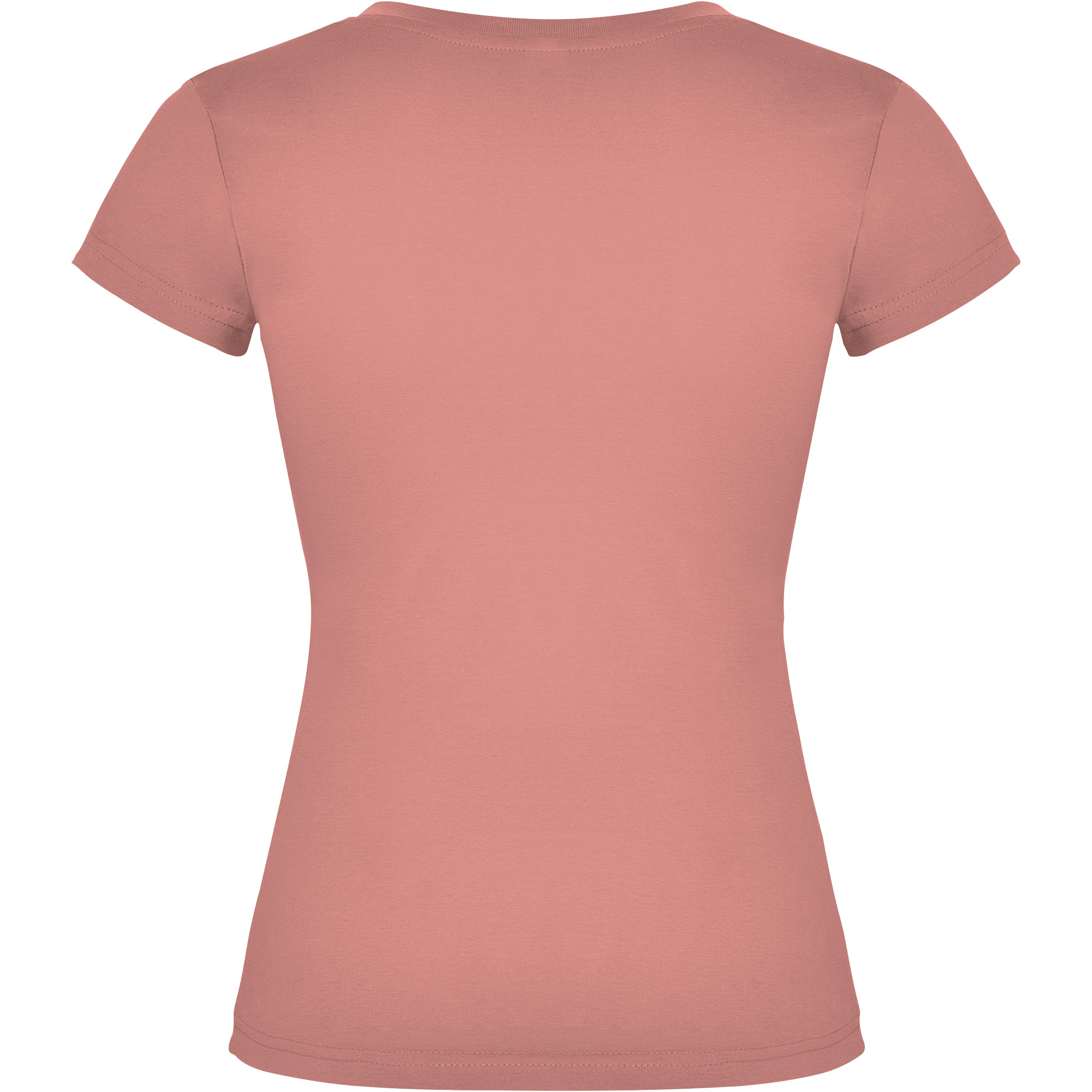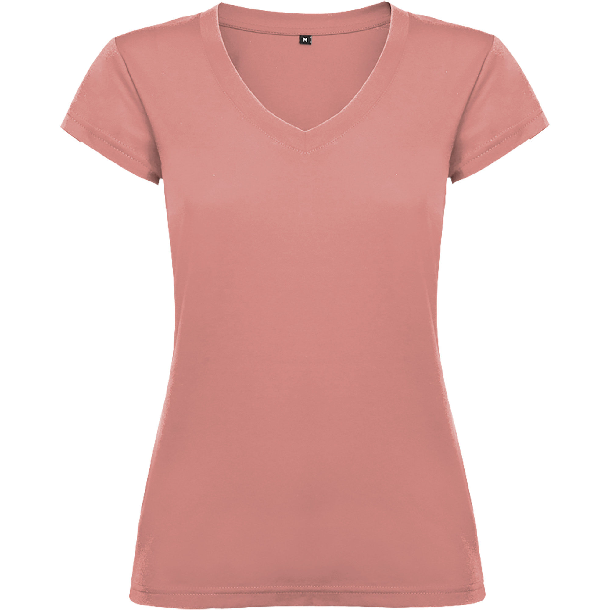 Camiseta de manga corta entallada en cintura. Cuello de pico en canalé 1×1. Cubrecosturas en cuello del mismo tejido.