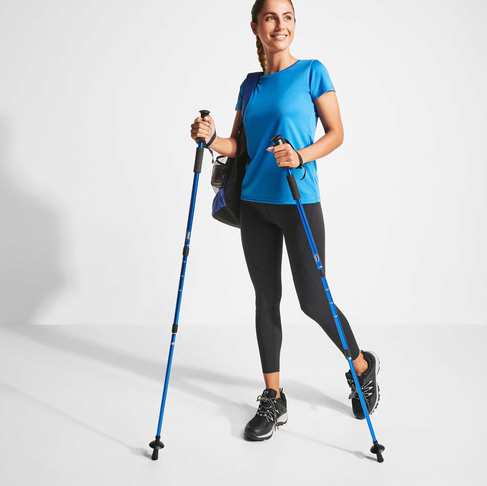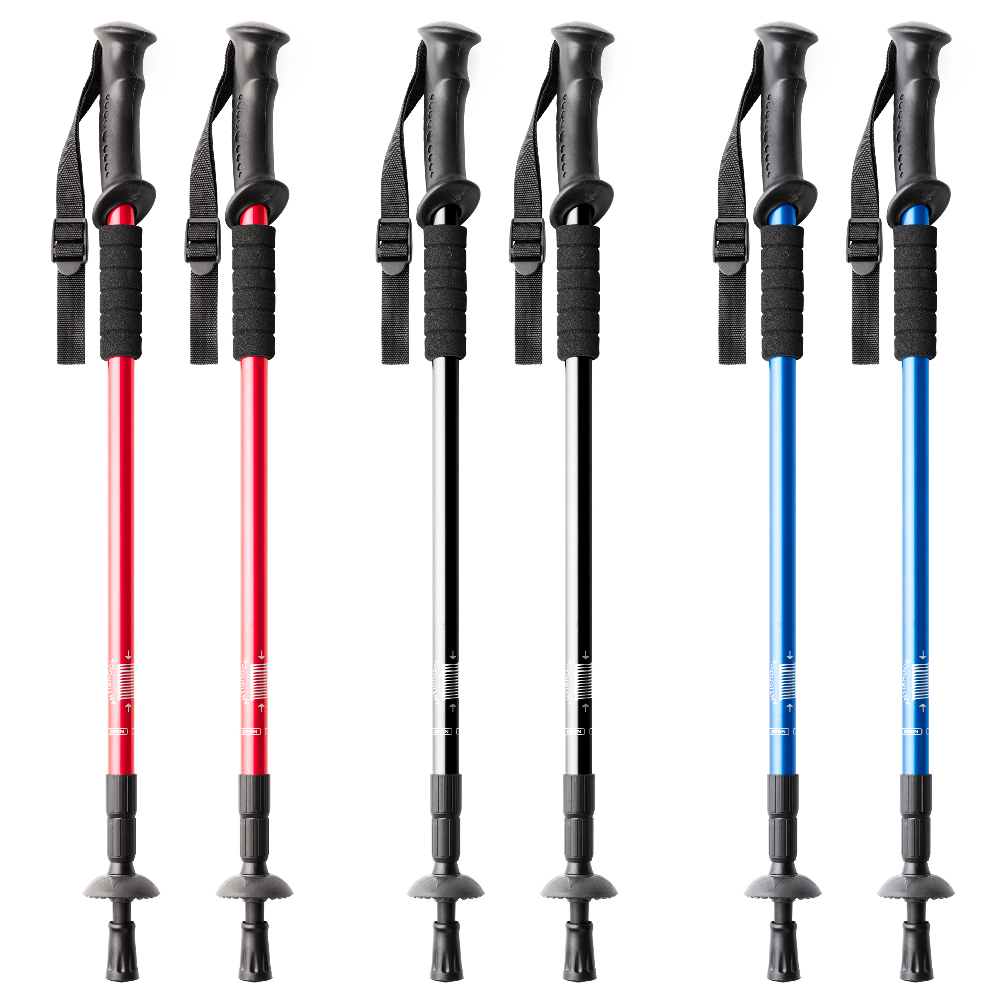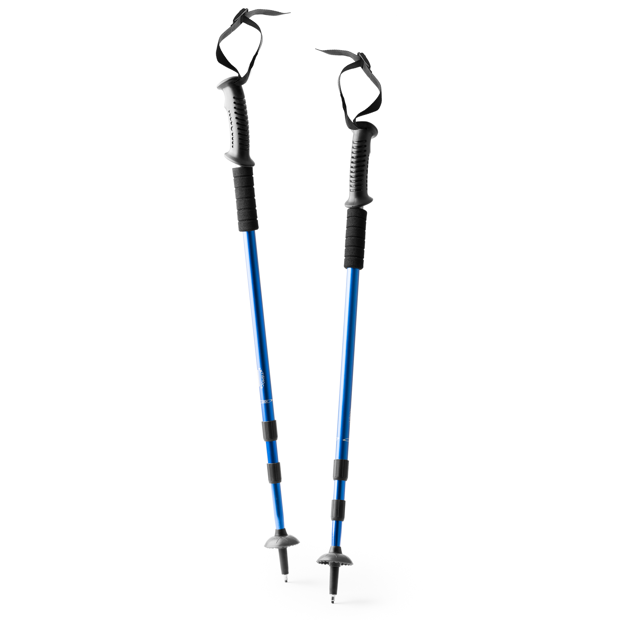 Set de bastones de trekking plegables en aluminio con sistema de amortiguación. Agarre ergonómico y cinta de seguridad ajustable. Incluye accesorio para nieve. Superficie de contacto con el suelo reforzada.