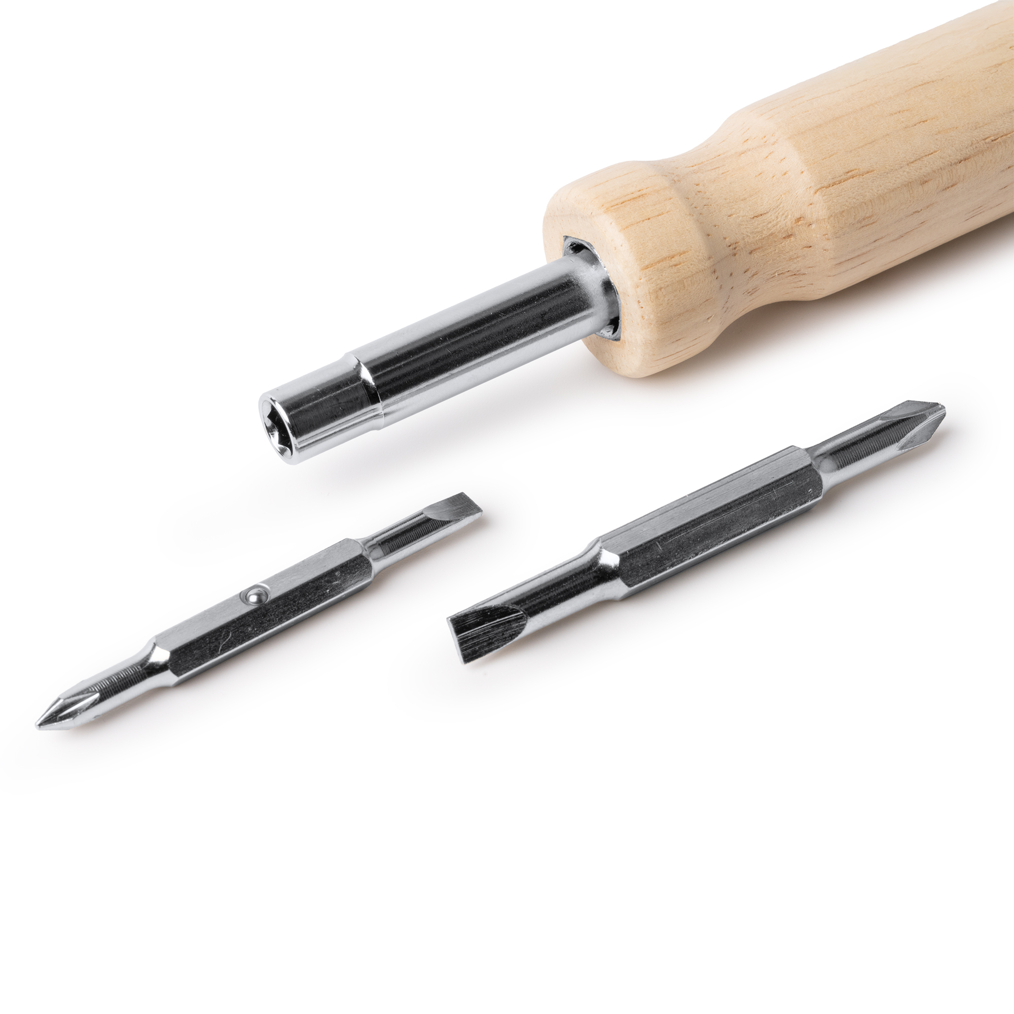 Destornillador elaborado en acero inoxidable con mango redondo en madera. Cuenta con un sistema de puntas diferentes intercambiables de fácil montaje. Estas puntas incluyen destornillador de estrella y destornillador plano, ambos en dos tamaños diferentes.